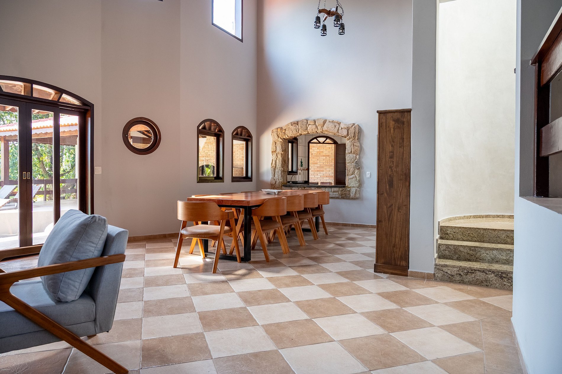 Sala de jantar sofisticada com mesa para 11 pessoas, além de mesa auxiliar para 4 lugares na cozinha