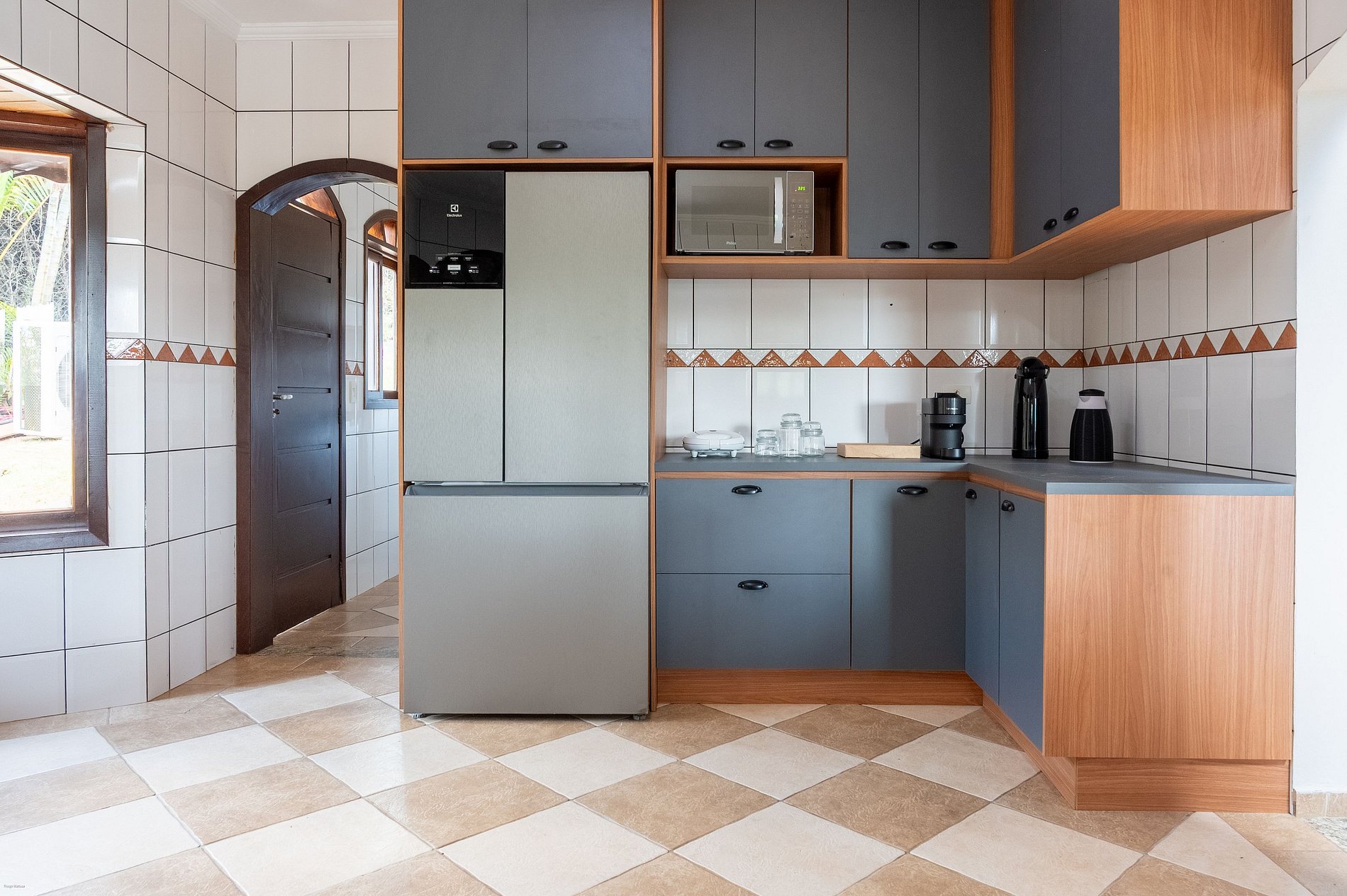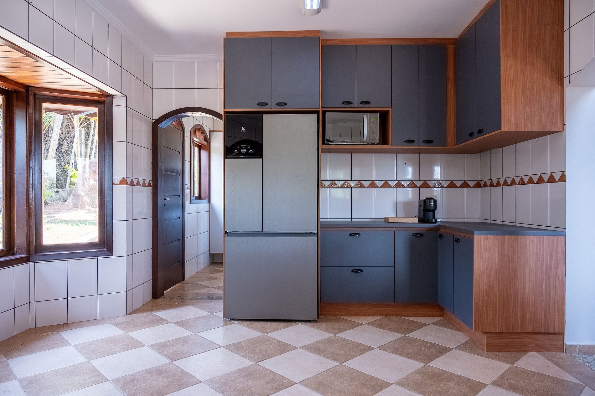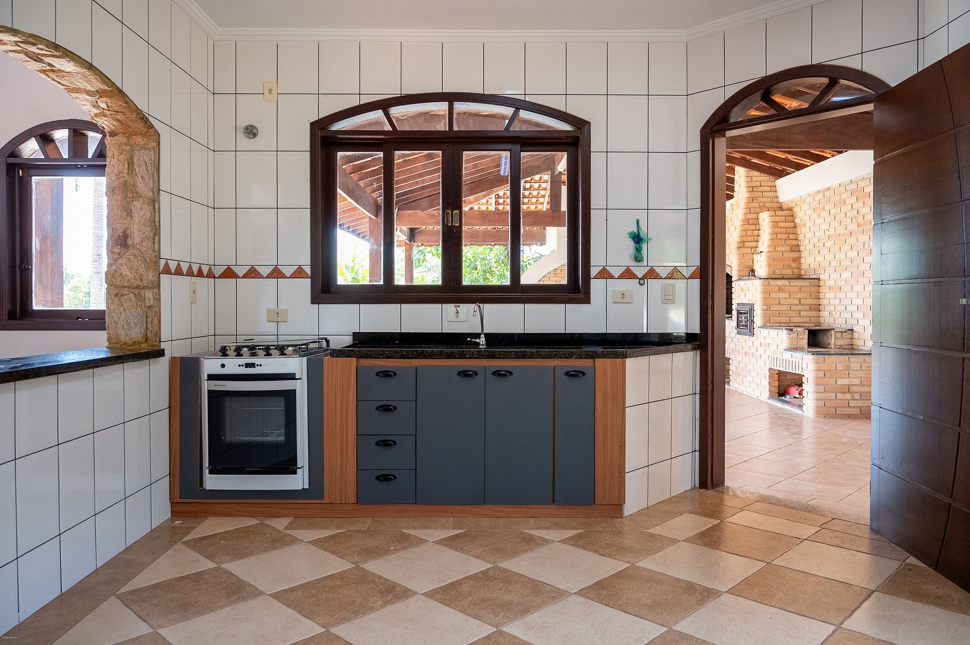 Cozinha completa com fogão, forno a lenha, geladeira side by side e freezer